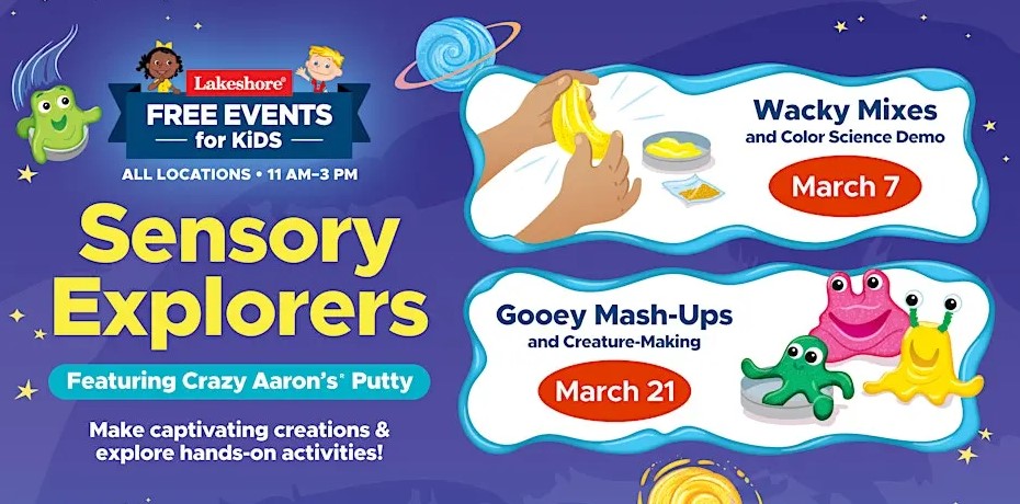 Calling all fans of Crazy Aaron’s putty! Globs of fun are on the way with two different feel-good events that add a dash of science to sensory play. At our first event, kids create custom concoctions and learn how color, light and sparkle interact. At our second event, they’ll make gooey-but-cute creatures from another realm! Swing by our Play & Discover area to get hands-on with featured products. And parents and guardians, be sure to check in when you arrive for a chance to win a $100 Lakeshore e-gift card!